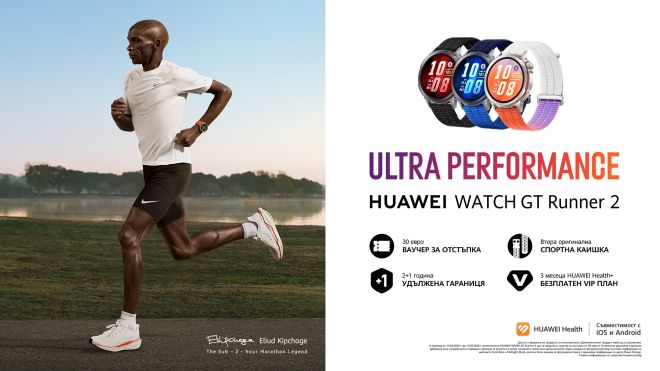 Новият HUAWEI WATCH GT Runner 2, създаден специално за бегачи с различно ниво на подготовка, вече е наличен на българския пазар на препоръчителна цена от 399 евро, а до 15-и май 2026 включително и със стартова отстъпка от 30 евро и други екстри. Сред тях са една година удължена гаранция, която се добавя към стандартната двугодишна гаранция, и 3-месечен абонамент за VIP услугата Huawei Health+.
